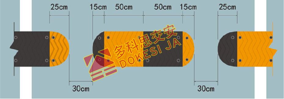 在交通設(shè)施安裝工程中,減速帶通常采用“一條壟”安裝方式,即從路的一邊平鋪到另一邊,以此達(dá)到車輛硬性減速的設(shè)置目的,這樣安裝不僅給車輛和司機(jī)帶來較強(qiáng)顛簸,同時(shí)也給周圍居民帶來不和諧的噪音。為提倡穩(wěn)靜化交通理念,倡導(dǎo)文明出行方式,可采用下圖所示的“減速帶安裝方式”,將“減速帶”中間空出兩個(gè)空缺,便于汽車輪胎穩(wěn)靜通過,司機(jī)看到減速帶后,只要降低車速,對(duì)準(zhǔn)兩個(gè)空缺,就能很平穩(wěn)地通過減速帶,這樣的安裝方式,即能達(dá)到降低路段車輛通過速度,也可避免車輛快速通過時(shí)的超強(qiáng)顛簸。