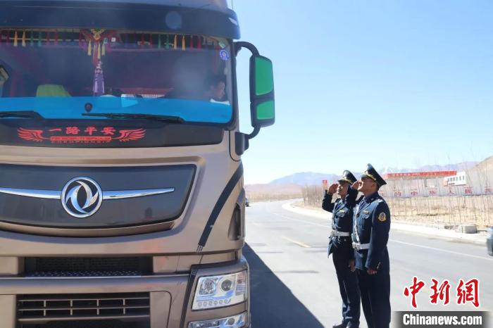 圖為阿里公路部門(mén)路政執(zhí)法人員檢查貨運(yùn)車(chē)輛。西藏自治區(qū)路政管理局供圖